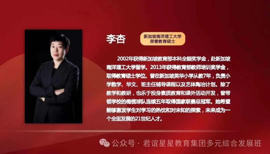 李杏老師憑借多年的新加坡公立小學教育教學管理經驗,將三大核心內容融入到君誼星星多元綜合發展班管理中。即:基礎教育理念:全人教育(關注學術、品格、社交多維發展)、雙語教學模式(英語+母語的沉浸式環境);特色課程設計:科學探究課(項目式學習激發創造力)、移動課堂(鏈接真實場景培養責任意識以及能力意識);課堂管理方法:新加坡課堂精細化規則體系、激勵機制(如分層任務設計、正向反饋策略)。這些寶貴的經驗助力君誼星星多元綜合發展班國際化發展,推動了學生核心素養提升!